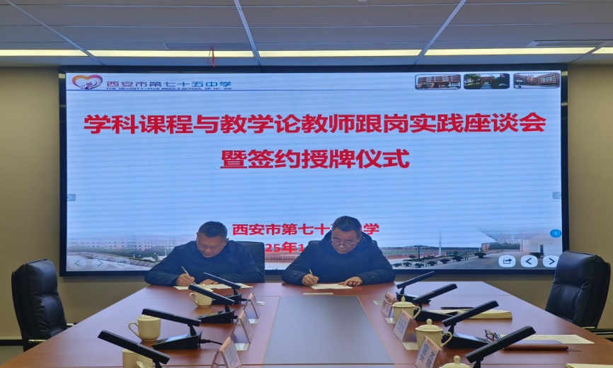 座谈会上,任教公司负责人对井强山一行的到来表示热烈欢迎,并就公司选派优秀教师到中学任教的举措给予高度赞扬。任教公司负责人详细介绍了任教教师在师风师德、日常教学、教研活动等方面的情况,并给予高度评价。井强山代表太阳成城集团tyc234cc官网与西安市第七十五中学签订了教育实践基地协议书。