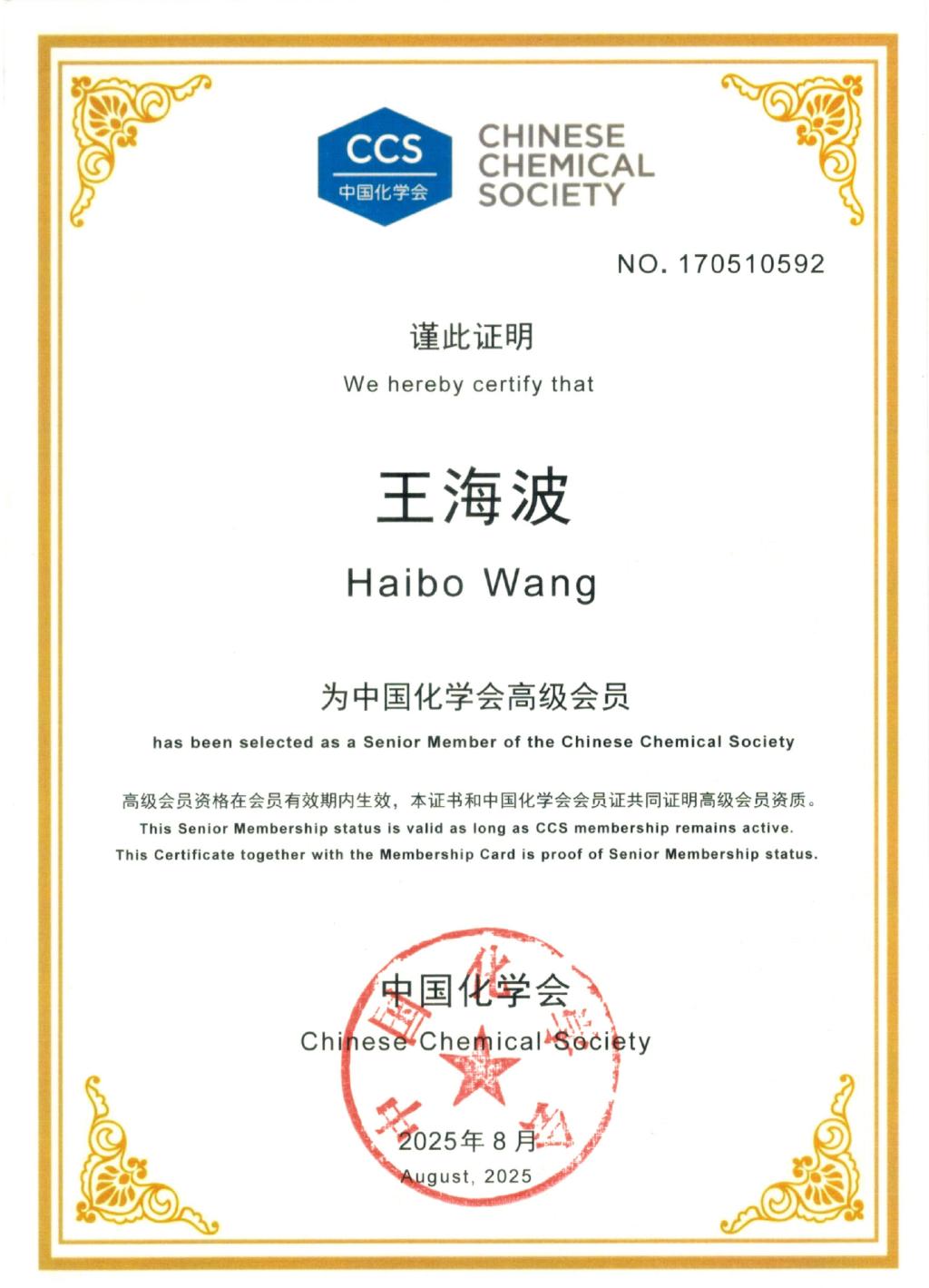 近日,中国化学会公布了新晋升为高级会员名单。公司太阳成城集团tyc234cc官网王海波教授成功晋升成为高级会员。