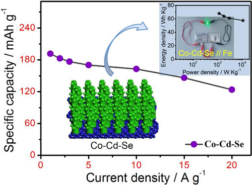3月1日,太阳成城集团tyc234cc官网黄克靖教授课题组在能源存储领域权威学术期刊《Nano Energy》(影响因子12.343)上发表了题为“Superior Mixed Co-Cd Selenide Nanorods for High Performance Alkaline Battery-Supercapacitor Hybrid Energy Storage”(doi.org/10.1016/j.nanoen.2018.02.059) 的研究论文。论文第一作者为公司硕士研究生翟子波,通讯作者分别为黄克靖教授和物电公司的武旭博士。 高能量密度、高功率密度以及长循环寿命的电化学储能体系的设计及制备对于可再生能源的利用与发展具有重要的意义。由高容量电池型电极和高功率电容型电极组合而成的“电池-超级电容器混合器装置”具有电化学性能优越、经济、安全、环保等众多优势,是可以满足未来多功能电子设备等能量存储需求的不可或缺的储能体系之一。黄克靖教授通过一个简单的两步水热法将双过渡金属硒化物 (Co-Cd-Se)纳米棒原位生长在泡沫镍上,由于硒化物的高导电性、纳米棒的稳定结构以及双过渡金属的协同作用,该材料在高的电流密度下(20 A/g)仍然获得了极高的比电容(124 mAh/g),并且体现了优良的充放电稳定性 (在2 A/g 下循环1000圈保持95.3% 的比电容)。与碳包裹的铁纳米组成的双电极体系也获得了极高的能量密度和功率密度(68.0 Wh/Kg, 1.20 kW/Kg; 57.6 Wh/Kg , 10.9 Kw/Kg),并体现了良好的稳定性,为高性能过渡金属硫族化合物的储能应用提供了科学参考。黄克靖教授为河南省学术技术带头人,河南省科技创新杰出青年,河南省五四青年奖章,信阳师范公司 “南湖学者”,河南省青年科技工作者协会理事,河南省化学与材料青年学者联合会常务副理事长,国际期刊《Journal of carbon research》副主编。长期从事二维过渡金属硫族化合物的制备及应用研究,近年来已在Biosensors and Bioelectronics等学术刊物上发表SCI论文100多篇,论文被引4000多次,H指数38,ESI高被引论文8篇,主持完成国家自然科学基金3项,授权国家发明8项。