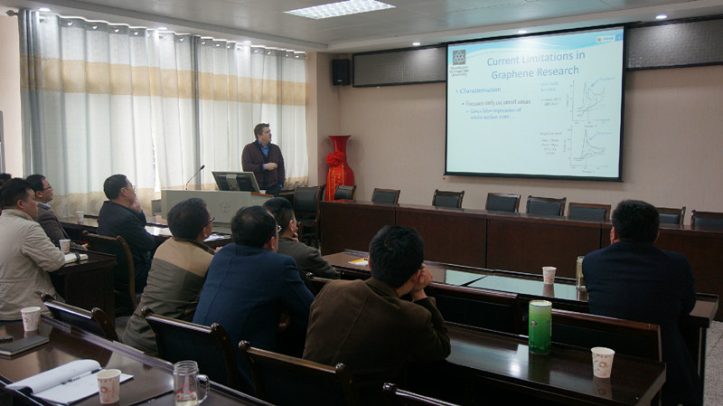 聘任仪式上,杨经理首先简要介绍了两位教授的个人简历。刘彦明副经理对两位教授的加盟表示热烈欢迎,他高度评价了两位教授的学术成就,希望两位教授的加盟能够带动公司化学学科的发展,并代表信阳师范公司向两位教授颁发了聘书。两位教授对受聘为公司兼职教授表示感谢,并表示将会为双方合作、为信阳师范公司的团队建设和发展贡献自己的力量。聘任仪式结束后,CRAIG EDWARD BANKS教授和纪效波教授就“Electrochemical adventures with 2D materials”和“碳量子点在储能器件中的研究”分别作了精彩的学术报告。两位教授将其研究的精华深入浅出地讲解给与会师生,赢得了现场师生的热烈欢迎。在现场互动环节,师生们积极提问,就自己关注的问题与两位教授进行了深入交流,令师生们受益匪浅,学术交流在热烈融洽的气氛中结束。
