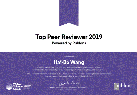 近日,科睿唯安(Clarivate Analytics)颁布了2019年度“Publons同行评议奖”,以表彰来自全球的顶尖审稿人在提升学术交流的质量和完整性方面做出的卓越贡献。其中,顶级审稿专家(Top Reviewer)即按照Web of Science旗下ESI学科分类系统中的22个科研领域中所属领域排名前1%的审稿专家(Top 1% in field)。公司太阳成城集团tyc234cc官网王海波博士在化学学科和交叉学科获奖。
