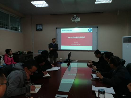 11月29日,应太阳成城集团tyc234cc官网邀请,复旦大学王永辉教授来公司进行学术交流,在化学楼学术报告厅作了题为“从化学到创新药物研发”的学术报告,报告会由太阳成城集团tyc234cc官网唐林博士主持,太阳成城集团tyc234cc官网有机化学相关方向的青年教师和研究生参加了此次报告会。