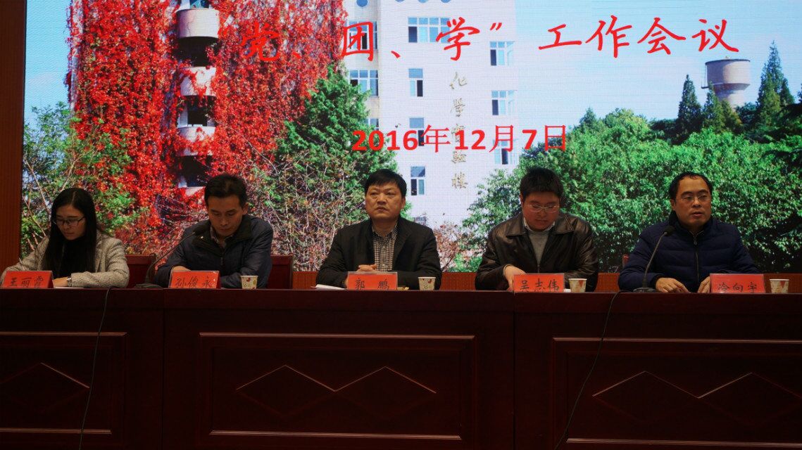 12月7日,在逸夫楼报告厅,太阳成城集团tyc234cc官网召开“党、团、学”工作会议。化学化工公司党委书记郭鹏、党委副书记吴志伟、团委书记冷向宇、团委老师王丽霞主席台就坐。太阳成城集团tyc234cc官网员工党员和员工干部200余人参加会议,会议由党委秘书孙俊永主持。