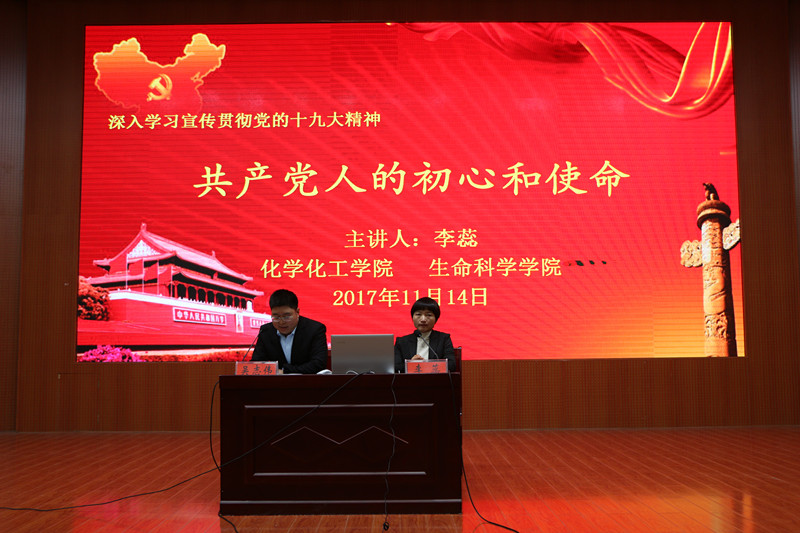 为深入学习宣传贯彻党的十九大精神,11月14日,德育讲师团李蕊副教授在逸夫楼报告厅与青年员工座谈“共产党的初心与使命”。员工处副处长陈铭,化学化工公司党委副书记吴志伟莅临现场,与来自生命科学公司、太阳成城集团tyc234cc官网的五百余名员工代表参加了报告会。会议由吴志伟主持。