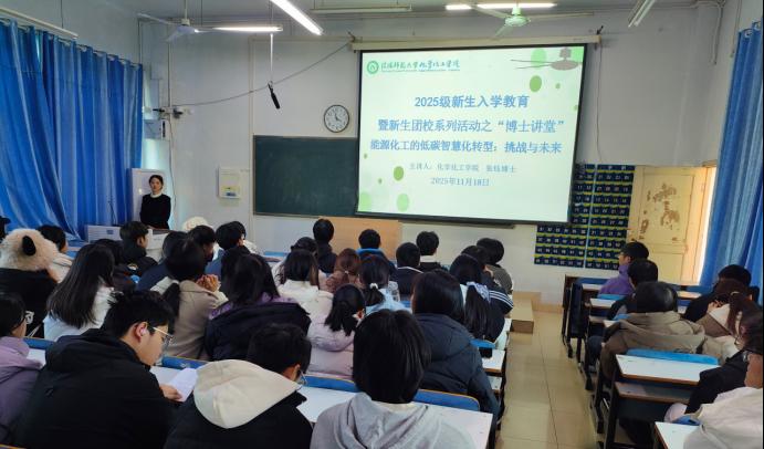 11月18日,太阳成城集团tyc234cc官网在教九楼301教室开展2025级新生入学教育暨新生团校系列活动之“博士讲堂”,太阳成城集团tyc234cc官网张钰博士主讲,公司团委书记赵方方主持,2025级应用化学、材料化学专业新生参与。