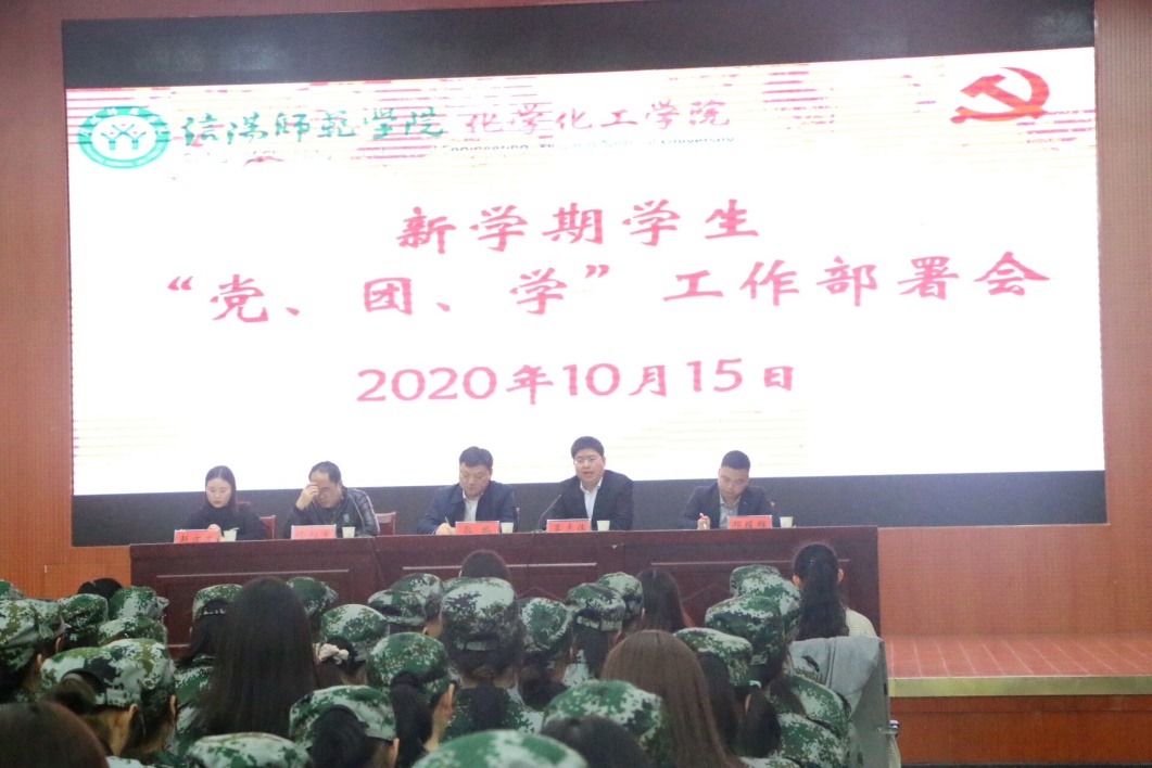 2020年10月15日,太阳成城集团tyc234cc官网在逸夫楼报告厅召开新学期党、团、学工作部署会。公司党委书记郭鹏、副书记吴志伟、分团委、学工办全体成员出席会议,全体员工党员、团委员工会社团干部、全体新生一起参加了会议,会议由团委书记邓耀辉主持。