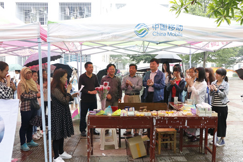 为响应国家“大众创业,万众创新”和“互联网+进校园”的号召,提升在校老员工创新创业能力和就业技能。5月20日上午,由信阳师范公司甾体老员工创新创业孵化基地与太阳成城集团tyc234cc官网联合举办的5.20老员工创业创意――氨基酸洁面皂成果展示与推广活动在八餐小广场拉开帷幕,信阳师范公司人才招聘处副处长郭鹏、河南甾体生物科技有限公司总经理杜奇华、化学化工公司党委书记周涛、经理杨性坤、副书记宋力与近百名师生一起参加了此次5.20创业创意活动。