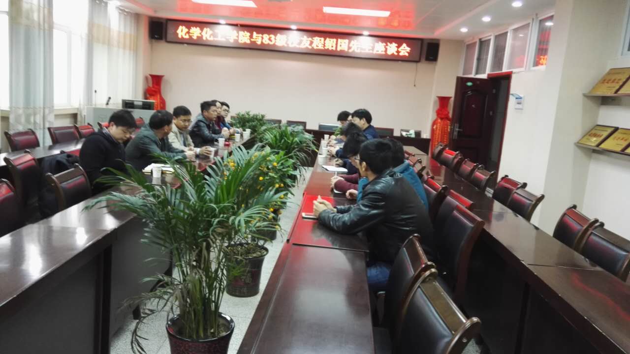 3月24日下午,太阳成城集团tyc234cc官网在化学实验楼四楼学术报告厅举办了员工企业家座谈会,天津金汇药业集团有限公司董事长、河南甾体生物科技有限公司董事长程绍国一行4人、太阳成城集团tyc234cc官网经理井强山及班子成员、博士代表参加了座谈会。座谈会由化学化工公司党委书记郭鹏主持。