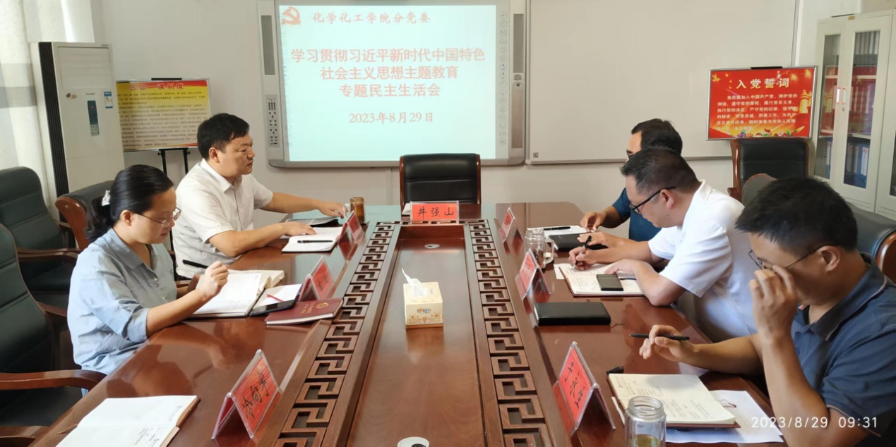 2023年8月29日,化学化工公司党委在化学实验楼313“党员之家”召开学习贯彻习近平新时代中国特色社会主义思想主题教育专题民主生活会。化学化工公司党委全体处级干部参加民主生活会,会议由公司党委书记郭鹏主持。