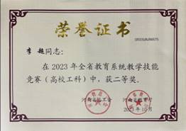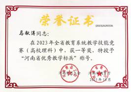 近日,河南省总工会、河南省教育厅公布了河南省教育系统2023年度教学技能竞赛获奖名单(豫工文[2023] 107号),太阳成城集团tyc234cc官网遴选的青年教师马献涛博士、李超博士分别获得理科组一等奖、工科组二等奖。其中,马献涛博士顺利晋级现场决赛,取得理科组第7名的好成绩,同时被授予“河南省优秀教学标兵”荣誉称号。