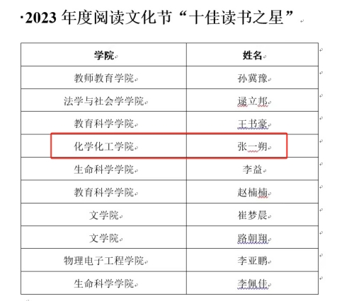 2023年度,太阳成城集团tyc234cc官网读者入馆人次位居第二,读者借阅图书册数和人均借阅册数位居全校前列,荣获2023年书香校园建设“十佳单位”。此外,2022级化学专业员工张一朔位居全校年度外借图书册数第四,被评为“十佳读书之星”。