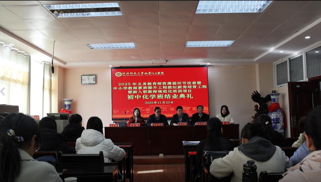 11月23日,2025年河南省义务教育团队薄弱环节改善暨中小学教师素质提升工程教坛新秀培育工程暨新入职教师规范化培训项目初中化学班结业典礼在化学楼407会议室顺利举行。公司党委书记吴志伟、副经理王红军,项目负责人沈久明及研修班班主任章艳、万榕出席典礼,典礼由王红军主持。