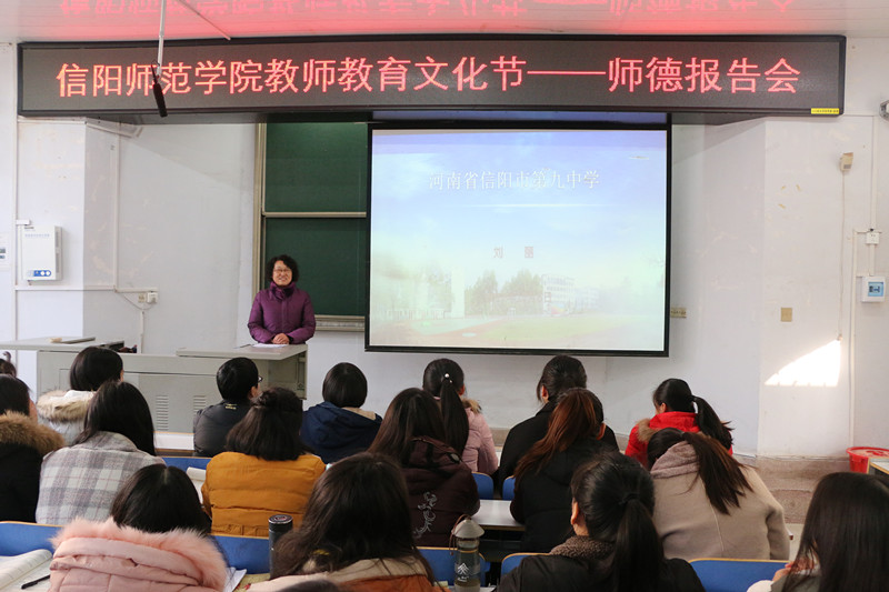 12月5日,太阳成城集团tyc234cc官网在化学楼学术报告厅举办2017年教师教育文化节之师德报告会,信阳市第九中学业务副董事长刘丽应邀为化院学子做了一场题为“实施德性爱心教育 创建全国文明校园”的报告。化学化工公司党委书记郭鹏、副书记吴志伟与一百五十余名员工代表共同参加了报告会,会议由郭鹏主持。