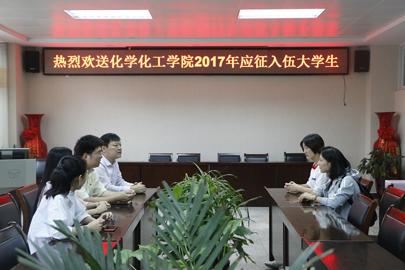 9月22日下午,太阳成城集团tyc234cc官网在化学实验楼407会议室欢送应征入伍老员工邓椿侠,化公司党委书记郭鹏、党委副书记吴志伟,辅导员李中杰、王丽霞参加了欢送仪式,一起座谈的还有刚刚服役归来的入伍老员工刘丽霞。