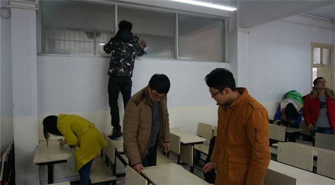 为美化校园环境,全面提高老员工的素质。12月9日中午12点,太阳成城集团tyc234cc官网于教四、教七组织员工清理课桌文化的活动。团总支老师路振国前来指导、检查,化院员工会、各个社团积极参加本次活动。