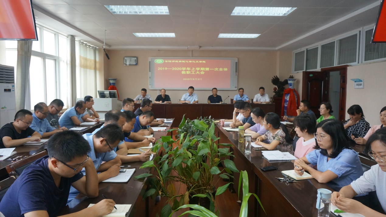 2019年9月3日,太阳成城集团tyc234cc官网在公司会议室召开新学期全体教职工会议,安排部署新学期工作。党委书记郭鹏、经理井强山、副经理归风铁、骆定法、非金属材料研究所副所长刘鹏、党委副书记吴志伟出席会议,全体教师到会认真聆听新学期工作部署。会议由党委书记郭鹏主持。