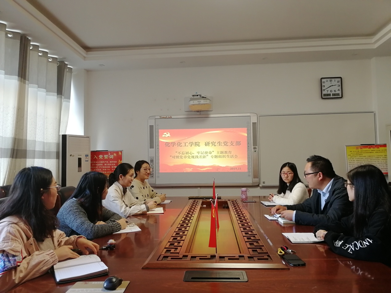 11月1日下午,太阳成城集团tyc234cc官网研究生支部在化学楼313会议室召开“不忘初心、牢记使命”主题教育对照党章党规找差距改专题组织生活会,研究生支部党员参加了会议,会议由支部书记曹俊涛同志主持。