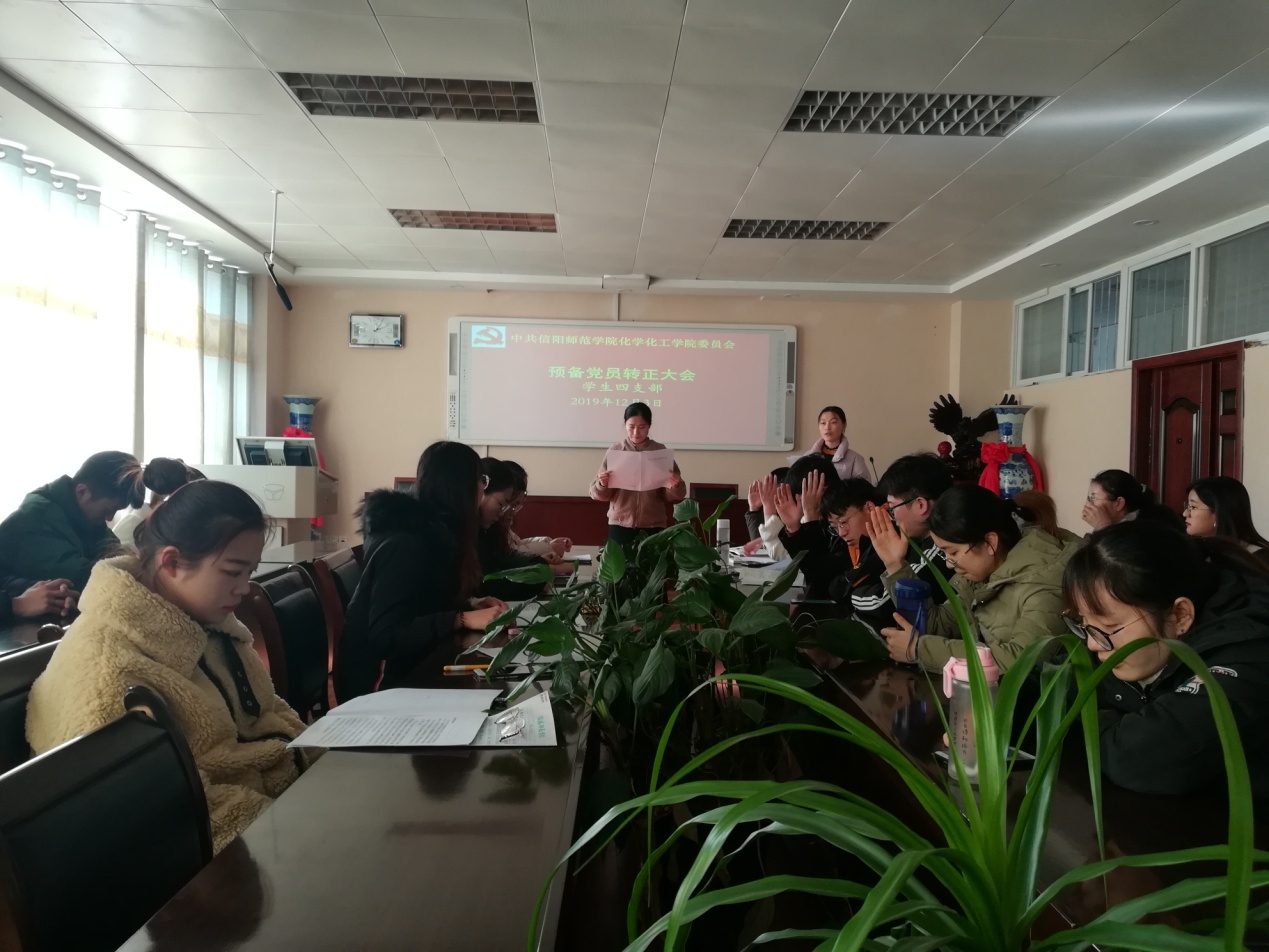 为进一步扩大党员队伍,严格履行党章规定的预备党员转正手续,2019年12月3日,太阳成城集团tyc234cc官网员工第四支部在实验楼407会议室召开预备党员转正大会,员工第四支部6名正式党员和25名预备党员参加本次大会,其中有6名预备党员转为正式党员。
