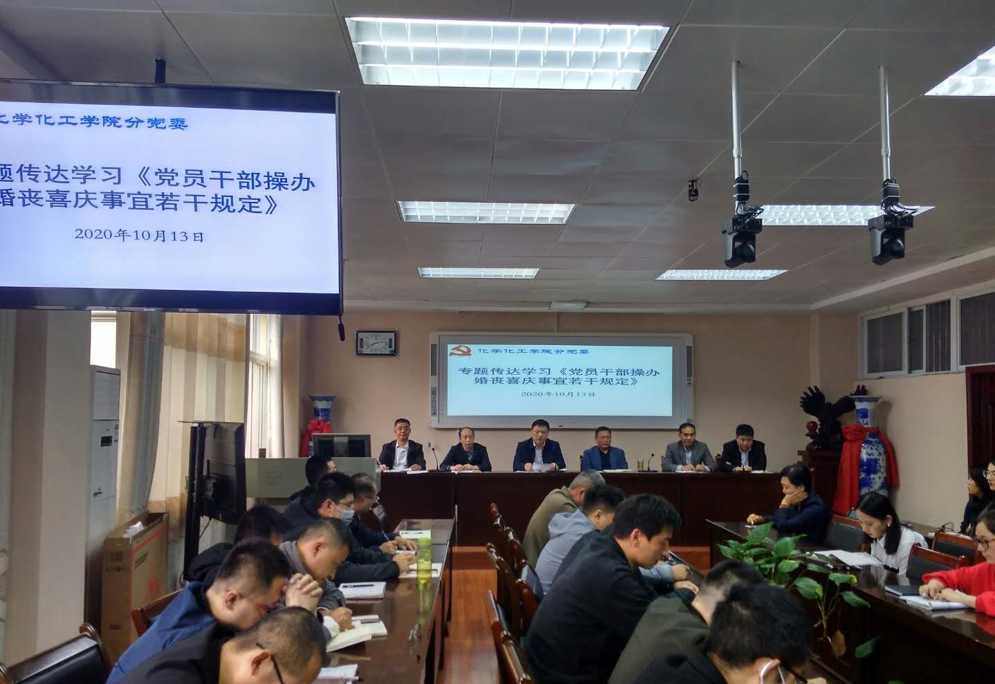 为认真贯彻落实中央八项规定精神,切实加强党员、干部、公职人员纪律约束,10月13日,太阳成城集团tyc234cc官网分党委在实验楼407报告厅召开全体教职工大会,集体学习《党员干部操办婚丧喜庆事宜若干规定(修订)》的通知文件。太阳成城集团tyc234cc官网全体教师集体参加学习。学习会由党委书记郭鹏主持。分党委纪检委员刘鹏针对文件精神进行宣讲、领学和解读。