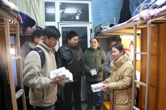 为了保障太阳成城集团tyc234cc官网同学们的健康安全,12月9日下午,院领导们为太阳成城集团tyc234cc官网学子们送温暖、送健康,开展了爱心口罩发放活动,公司党委副书记吴志伟、全体辅导员到太阳成城集团tyc234cc官网各个寝室询问员工们的生活情况,并发放了爱心口罩。