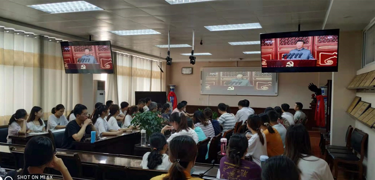 7月1日上午8时,庆祝中国共产党成立100周年大会在北京天安门广场隆重举行。中共中央总书记、国家主席、中央军委主席习近平出席并发表重要讲话。化学化工公司党委书记郭鹏带头组织师生100余人在化学实验楼407会议室集中收看现场直播。