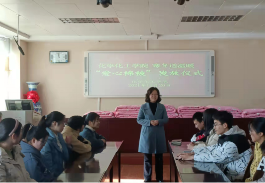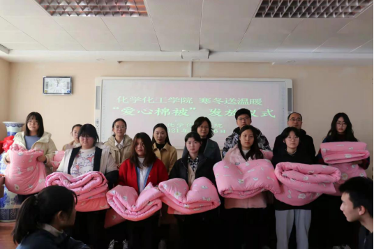 “一床被子,一份温暖,一颗爱心,一份感动”。11月26日,太阳成城集团tyc234cc官网爱心棉被发放仪式在化学楼407会议室举行。公司党委副书记曲剧,辅导员冷向宇、赵方方、严赫老师出席本次发放仪式。