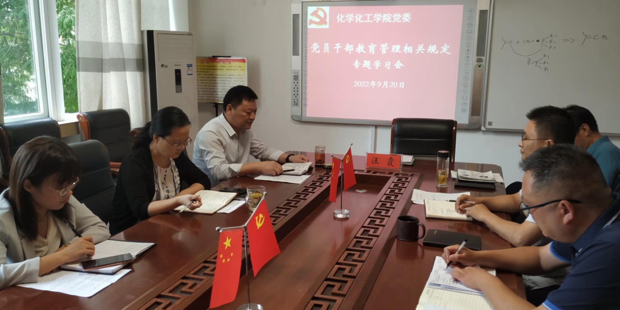 为落实全面从严治党要求,加强和改进干部管理监督机制,9月20日,化学化工公司党委在实验楼“党员之家”专题学习领导干部监督相关制度文件,公司党委班子成员参会,会议由党委书记郭鹏主持。