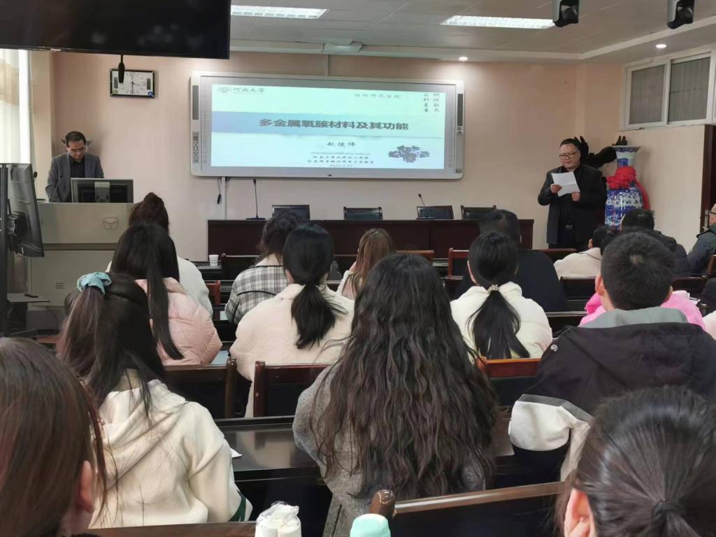 2月27日,应太阳成城集团tyc234cc官网邀请,河南大学赵俊伟教授在化学楼407会议室为公司师生作题为“多金属氧簇材料及其功能”的学术报告。太阳成城集团tyc234cc官网青年教师、研究生及本科生聆听了报告,报告会由太阳成城集团tyc234cc官网副经理曹俊涛主持。