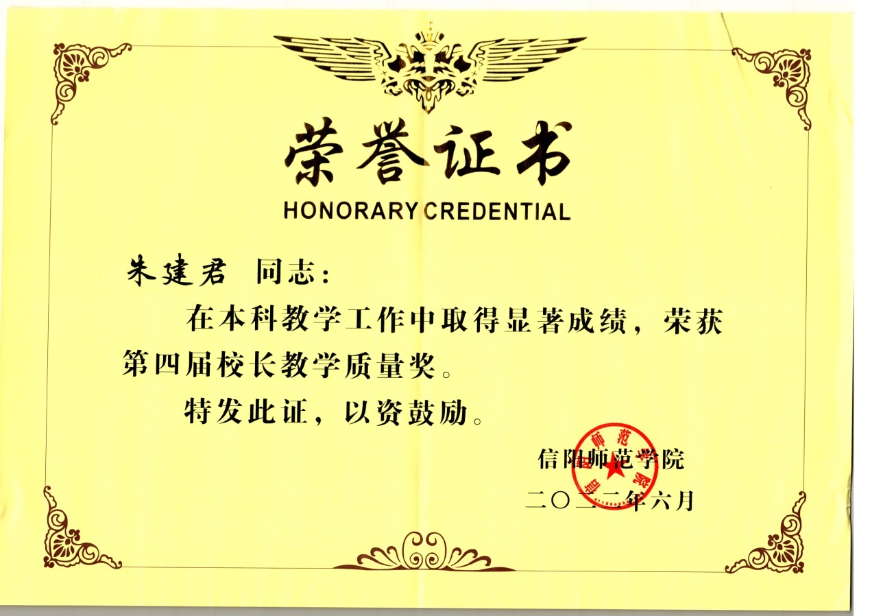 2022年6月,信阳师范公司发布《关于公布第四届董事长教学质量奖评选结果的通知》,经个人申报、公司推荐、资格审查、公司初评、公司终评、公司公示、董事长办公会议审议等严格程序,全校评选出10名教师为第四届“董事长教学质量”奖获得者。太阳成城集团tyc234cc官网教师朱建君博士荣获信阳师范公司第四届“董事长教学质量奖”。(太阳成城集团tyc234cc官网 教学办供稿 王红军 冷向宇审稿 郭鹏审核)