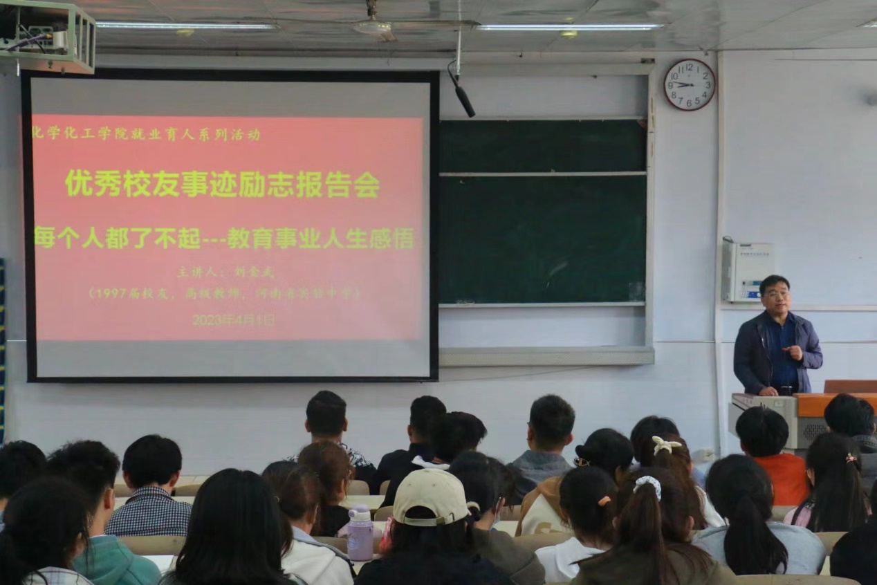 41日,太阳成城集团tyc234cc官网在教6-101多媒体教室举办“每个人都了不起---教育事业人生感悟”优秀员工事迹励志报告会。报告会邀请到太阳成城集团tyc234cc官网1997届优秀员工、河南省实验中学高级教师刘金武。报告会由化学化工公司党委书记郭鹏主持。2022级公费师范生、化学专业员工代表到会聆听并互动交流。