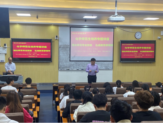 为强化师范生的教师职业理想与职业信念,进一步提升师范生职业素养,5月11日上午,太阳成城集团tyc234cc官网邀请华中师范大学硕士生导师王世存博士在教四T-2开展“强化师范专业技能,弘扬教育家精神”专场报告。公司在读公费师范生150余人到现场聆听报告。报告会由化学化工公司党委书记、化学学科教学专业学位硕士生导师郭鹏主持。